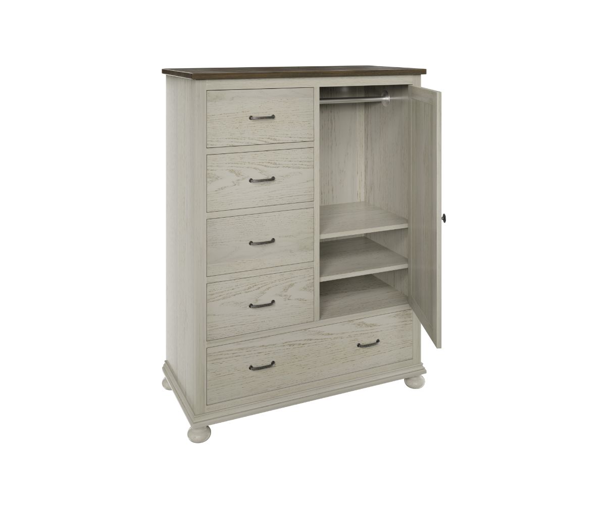 Features: • Dovetailed drawers • Full extension drawer slides • Clothes rod behind the door • Two shelves behind the door