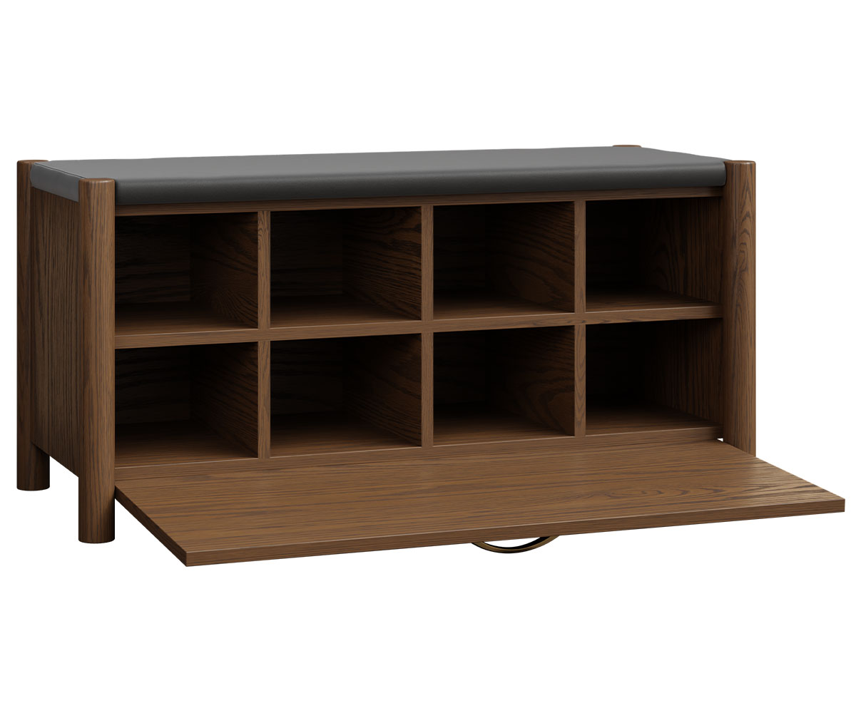 Features: • Hinged front folds down • Shelves behind doors with fixed dividers