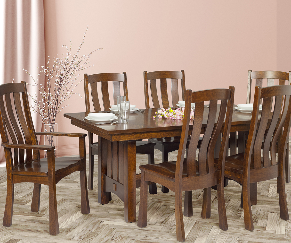 Table shown 42 x 66″ in quartersawn white oak with OCS-117 asbury stain. Square corner top with square edge. Monarch NT chairs.